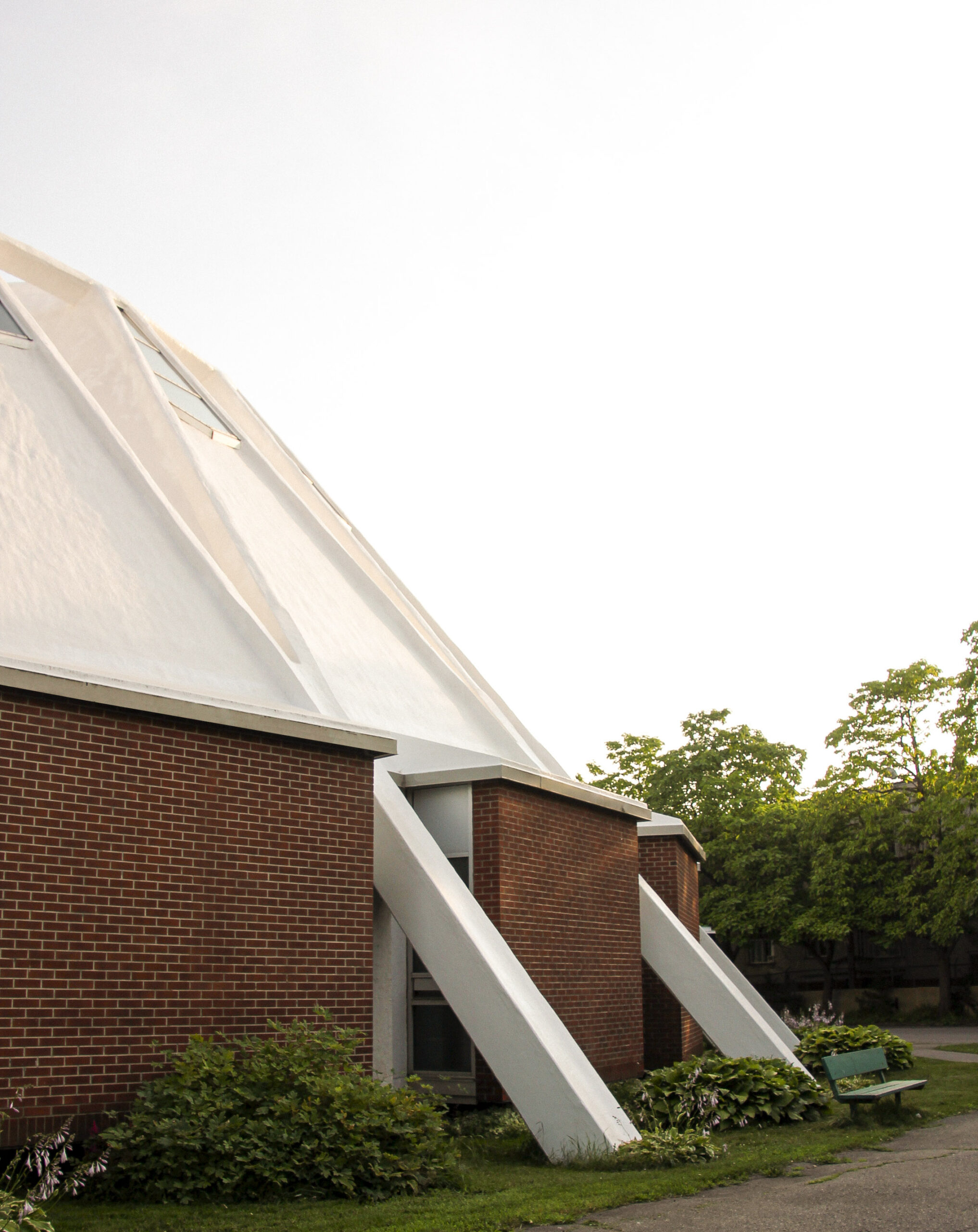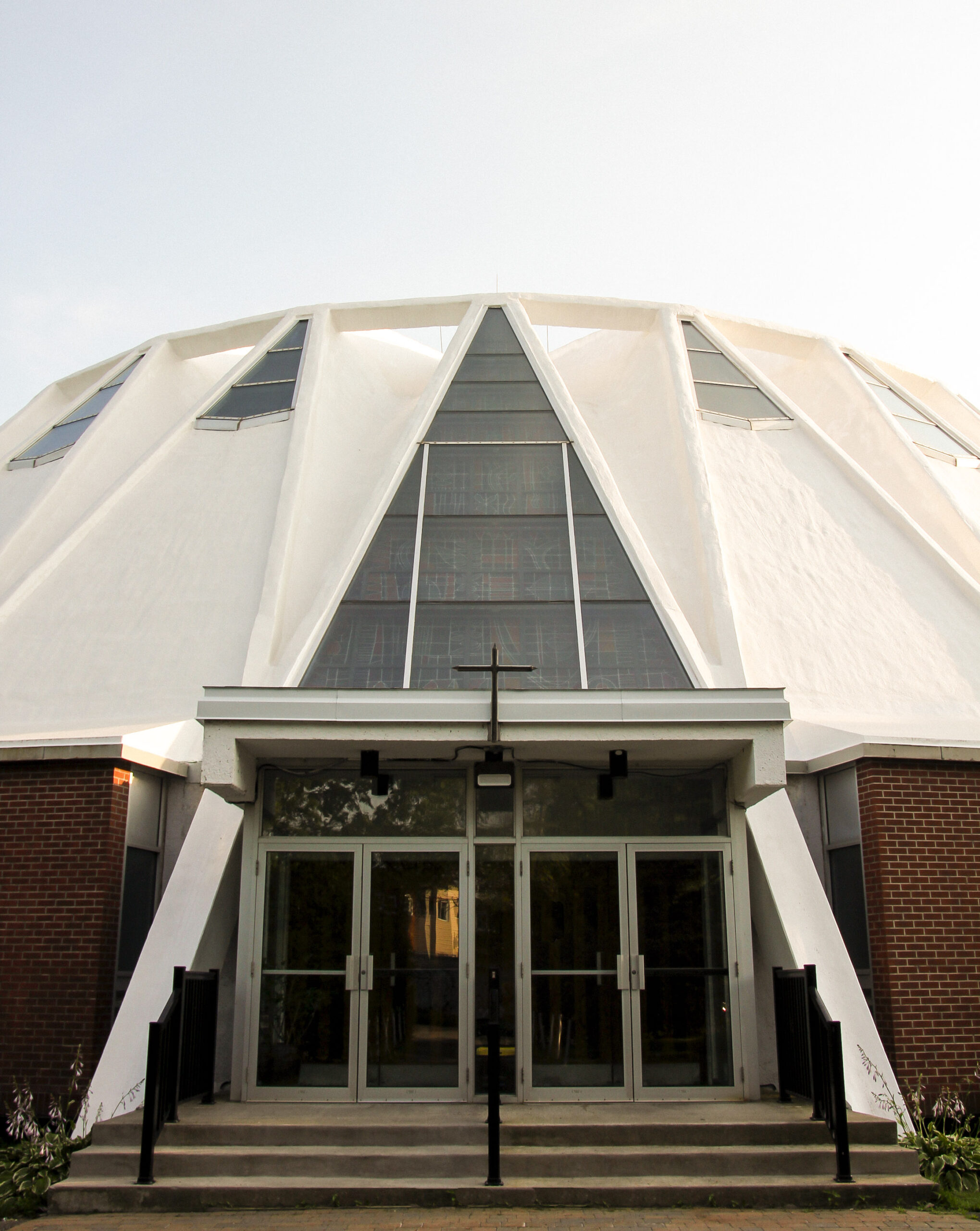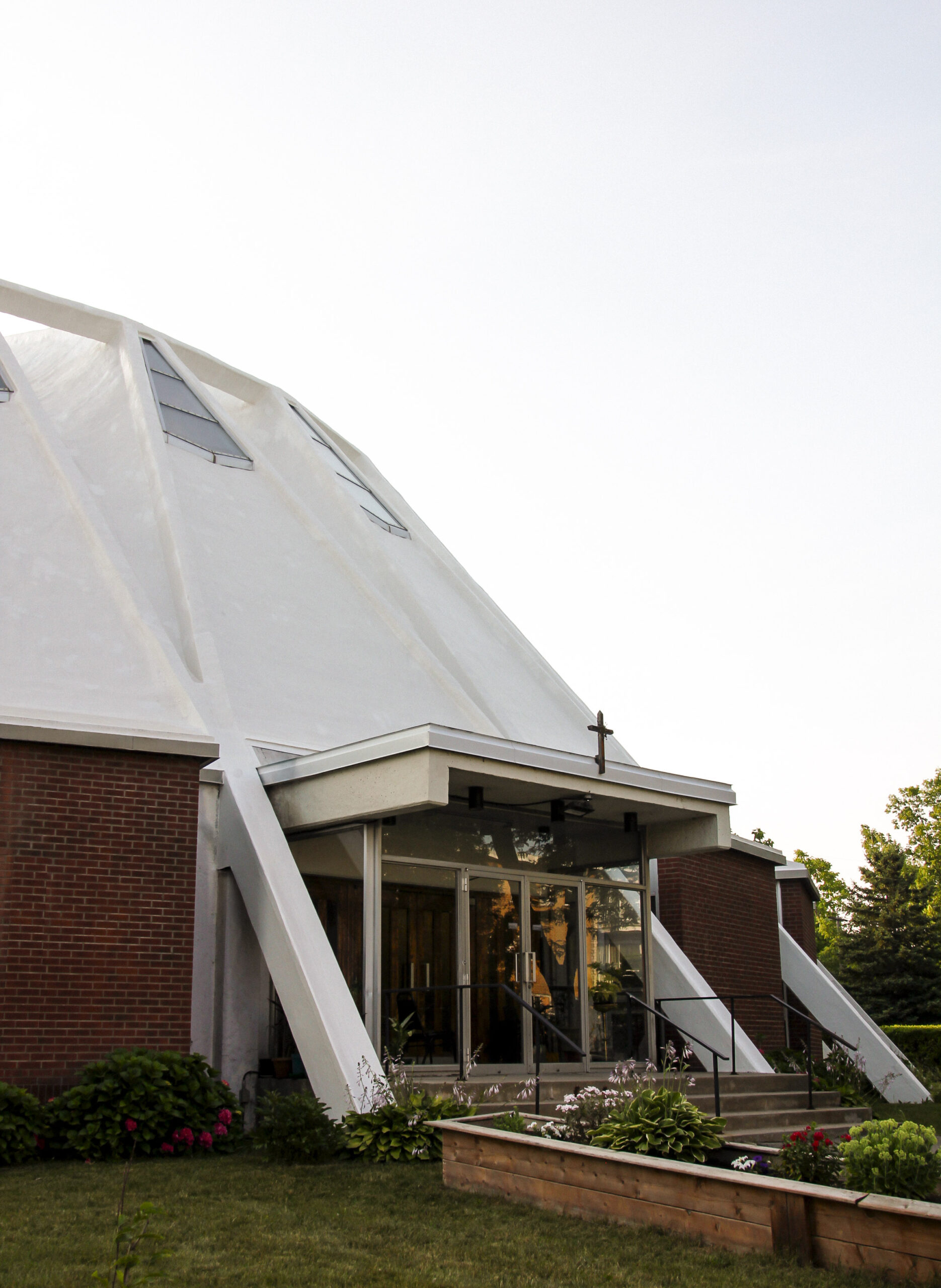 L’église St John de Brébeuf de LaSalle est le fruit d’un projet porté par une congrégation catholique romaine fondée en 1957 par la population anglophone de la paroisse. Ne disposant alors d’aucun lieu de culte dédié, les fidèles se réunissaient dans les sous-sols de deux écoles locales pour assister à la messe. En 1963, la construction de leur propre église débute sur un terrain partiellement offert par un donateur canadien-français. Confiée à l’architecte John Bird, la conception de l’église visait à renouveler l’expérience liturgique et à encourager une plus grande participation de la communauté. Bird imagine un lieu de culte où chaque messe devient un moment unique : l’autel principal, dépourvu de crucifix et de chandeliers, laisse place à une mise en scène mobile portée par les enfants de chœur. Le plan architectural rompt également avec la tradition : l’église adopte une forme ronde, symbolisant l’infinité de Dieu, et sa nef centrale, abaissée de 18 pouces, renforce le sentiment de recueillement. Cet aménagement est rendu possible grâce à la structure remarquable en béton préfabriqué, 24 colonnes de 21 tonnes chacune, disposées en rosette, qui permettent d’éviter tout appui intérieur et d’offrir un espace intérieur ouvert et monumental. En novembre 1964, peu avant la fin des travaux, l’église change de patronage, passant de Sainte Barbara – une figure légendaire contestée – à Saint-Jean-de-Brébeuf, un martyr canadien. Malgré quelques tensions liées à l’identité linguistique de ce choix, le père Dubé plaide pour une appellation bilingue comme geste d’unité entre les communautés francophones et anglophones de LaSalle. La nouvelle église accueille, pour la première fois, ses fidèles à la messe de Noël en décembre 1964.